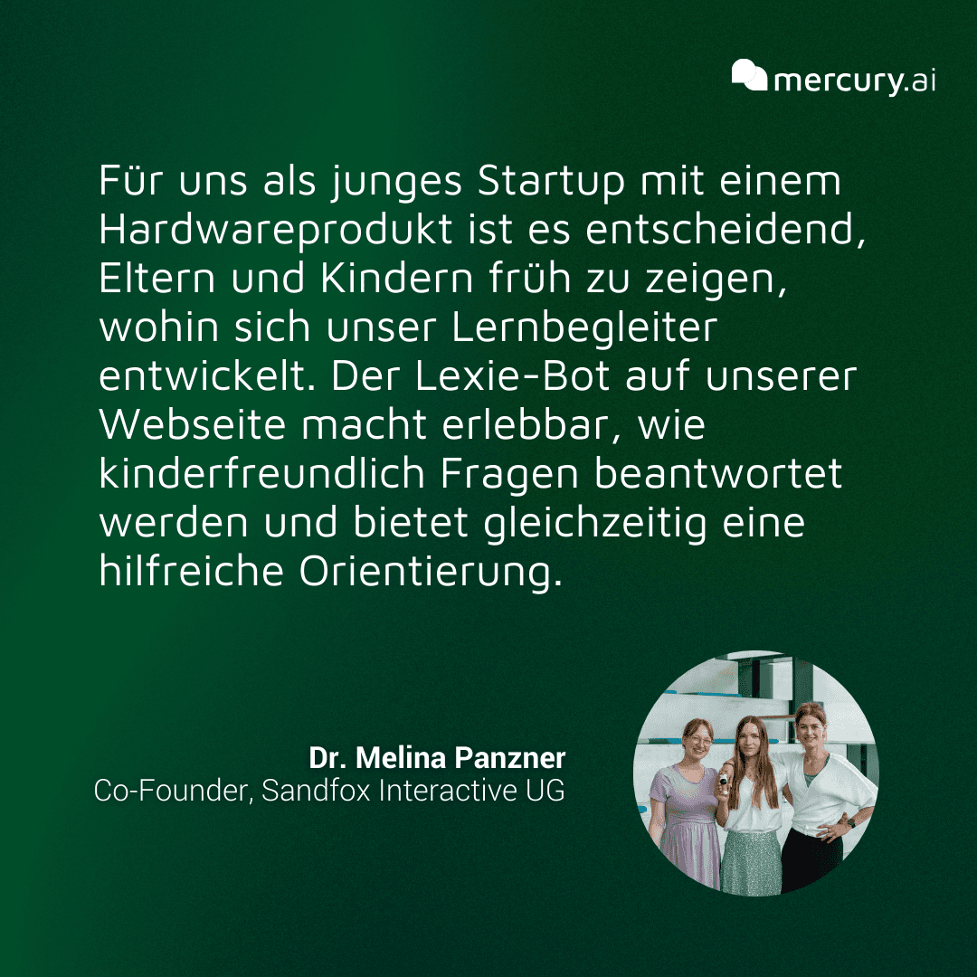 Sandfox Interactive revolutioniert als innovatives Startup die frühkindliche Bildung durch den KI-gestützten haptischen, aber bildschirmfreien Lernbegleiter Lexie. Als Technologiepartner unterstützt Mercury.ai Sandfox Interactive dabei, nicht nur Support zu leisten, sondern einen empathischen, KI-gestützten Dialog zu bieten, der sich visuell nahtlos in die Lexie-Welt einfügt.